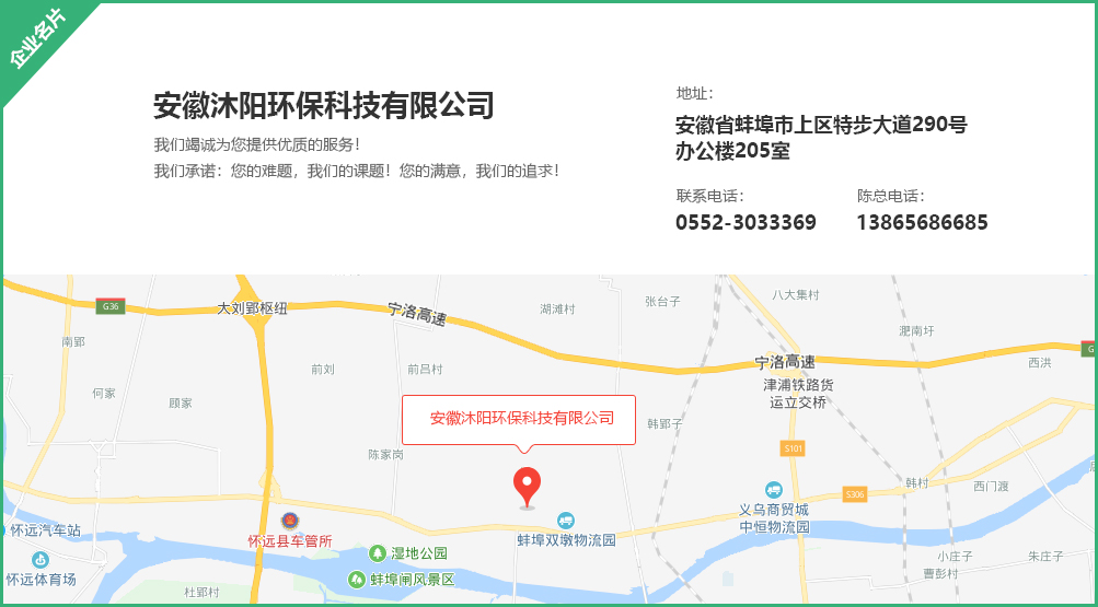 安徽沐陽環??萍加邢薰臼且患覐氖麓髿馕廴局卫懋a品的設計、制造、安裝、調試、服務為一體的專業化公司。公司位于皖北商貿重鎮-蚌埠市,毗鄰合肥、南京、鄭州等省會城市,京滬鐵路與合徐高速,蚌寧高速穿城而過,交通便利,地理位置優越。